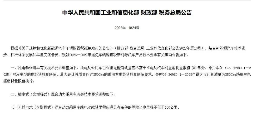 10月9日,工信部等三部門聯(lián)合發(fā)布公告,明確自2026年1月1日起,插電混動(dòng)車型享受購(gòu)置稅減免的純電續(xù)航門檻從43公里提升至100公里。