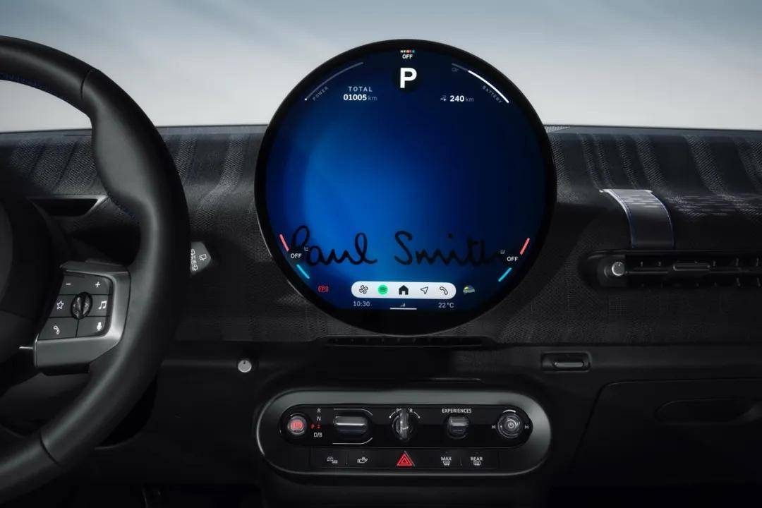 這種“雙向奔赴”最終成就的,不僅僅是一輛車,而是一種對抗現代性焦慮的解決方案。在Paul Smith看來,真正的風格不在于外在的標榜,而在于內心的豐盈;真正的奢侈不是金錢或擴張,而是對生活的細節保持敏銳的感知。比如車身上那些需要細看才能發現的炭藍色車標,輪轂中心蓋上的親筆簽名,以及在個人模式下中央圓屏上呈現的三種不同Paul Smith專屬背景。這些設計巧思如同埋下的“情緒彩蛋”,它們不是為了向路人炫耀,而是為了取悅駕駛者自己。這是一種極具當代精神的價值觀:在一個充滿了不必要的自我中心(unnecessary ego)的世界里,做一個“普通人”,去享受陽光,去發現日常中的非凡。