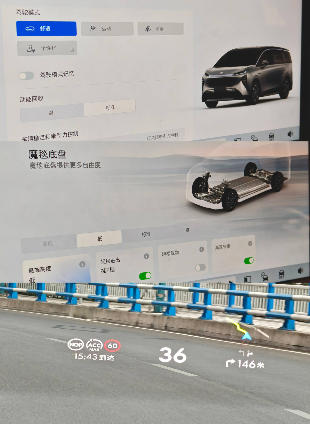 當(dāng)然,我最喜歡的還是在進(jìn)入自定義模式后,能把懸架阻尼單獨(dú)設(shè)置為“標(biāo)準(zhǔn)”——這反而是至境世家純電版的“最佳狀態(tài)”。避震阻尼既不會(huì)過(guò)軟,也不會(huì)過(guò)硬影響到后排乘客的舒適性,屬于兼顧了駕駛者操控需求與后排乘坐感受。反觀許多MPV車型上的舒適模式,過(guò)于強(qiáng)調(diào)對(duì)路面的隔絕感,把避震阻尼放得太軟,反而會(huì)導(dǎo)致車身姿態(tài)不夠干脆,從而導(dǎo)致乘客出現(xiàn)暈車的情況。